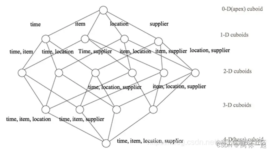 给定一个数据模型,我们可以对其上的所有维度进行聚合,对于N个维度来说,组合`的所有可能性共有2n种。对于每一种维度的组合,将度量值做聚合计算,然后将结果保存为一个物化视图,称为Cuboid。所有维度组合的Cuboid作为一个整体,称为Cube。 每一种维度组合就是一个Cuboid,16个Cuboid整体就是一个Cube。