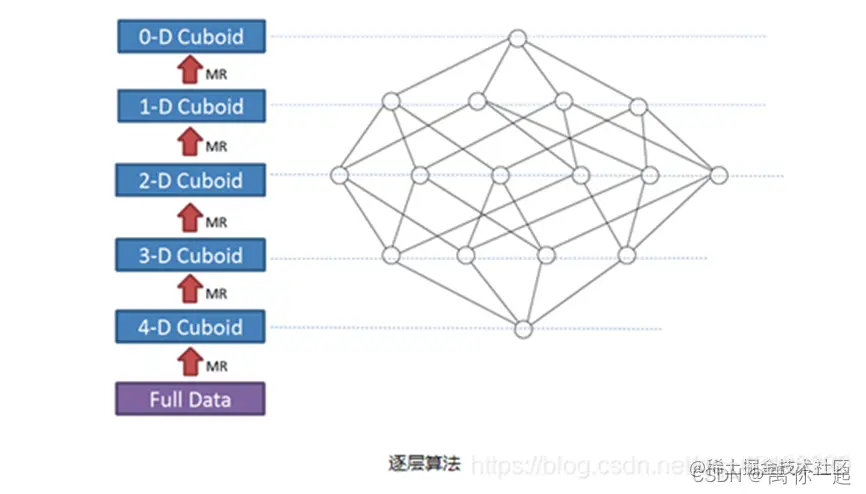 在逐层算法中,按维度数逐层减少来计算,每个层级的计算(除了第一层,它是从原始数据聚合而来),是基于它上一层级的结果来计算的。比如,[Group by A, B]的结果,可以基于[Group by A, B, C]的结果,通过去掉C后聚合得来的;这样可以减少重复计算;当 0维度Cuboid计算出来的时候,整个Cube的计算也就完成了。