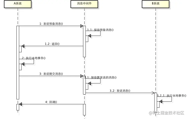 - 步骤三出错,这时候需要回滚预备消息,怎么回滚?答案是A系统实现一个消息中间件的回调接口,消息中间件会去不断执行回调接口,检查A事务执行是否执行成功,如果失败则回滚预备消息