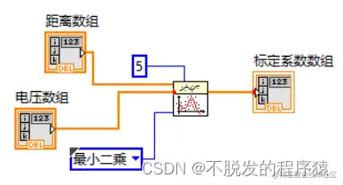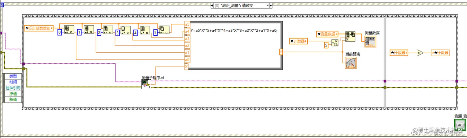 在“曲线拟合"事件结构中,通过将距离数组和电压数组利用5阶广义多项式拟合方式,计算出拟合系数并显示在标定系数上。"曲线拟合”值改变事件程序框图如下图所示: