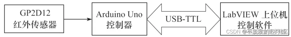 在整个系统中,Arduino Uno作为下位机,负责读取GP2D12红外传感器的输出值以及上传数据,LabVIEW软件作为上位机,负责将测量的电压转换为距离值并显示出来,上下位机利用USB-TTL接口实现通信。