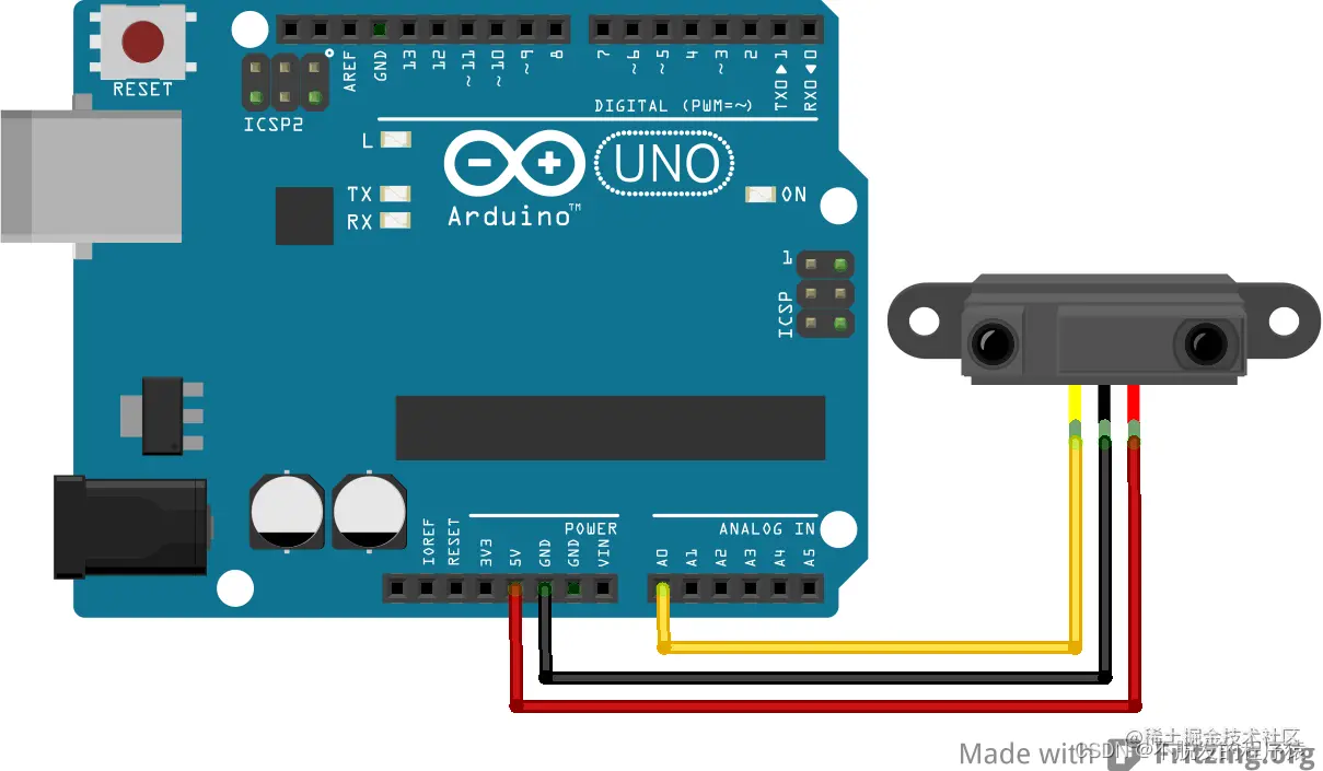 将GP2D12红外传感器的VCC、GND、Vo分别接至Arduino Uno控制板上的+5V、GND、模拟端口A0。最好在VCC与GND之间并联100uF的电解电容,以稳定GP2D12的供电电压,从而使输出电压更加稳定。红外测距系统硬件连接如下图所示: