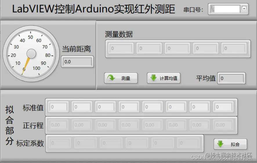 1、向下位机Arduino控制器发送红外数据采集命令,Arduino控制器通过串口接收上位机命令,完成红外数据采集之后并将采集的红外数据回传,LabVIEW软件将回传的红外数据转换为距离值并显示在前面板上。