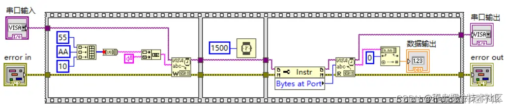 为了LabVIEW上位机程序结构更加清晰明了,更方便地进行程序设计,此处将LabVIEW与Arduino串口通信的LabVIEW上位机部分设计成测量子程序,在主程序中进行调用,其主要是向Arduino Uno控制器发送命令码,并获取Arduino Uno控制器返回的测量数据,实现测量功能。
