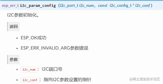 之后,初始化给定I2C端口的配置。为此,调用函数i2c_param_config()并将端口号和结构传递给该函数i2c_config_t。