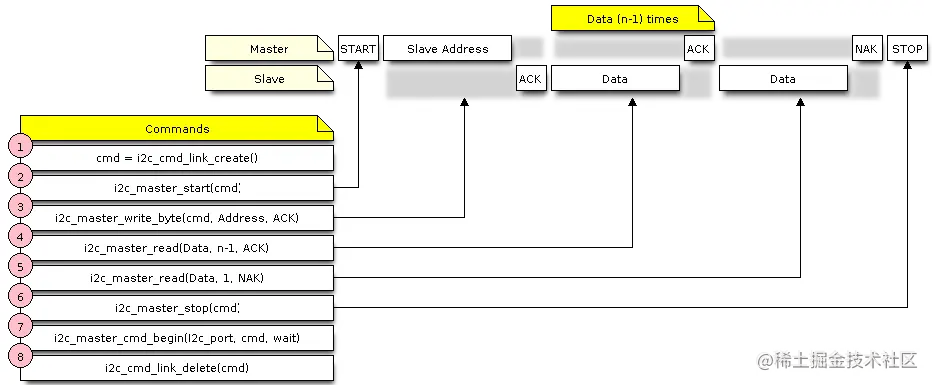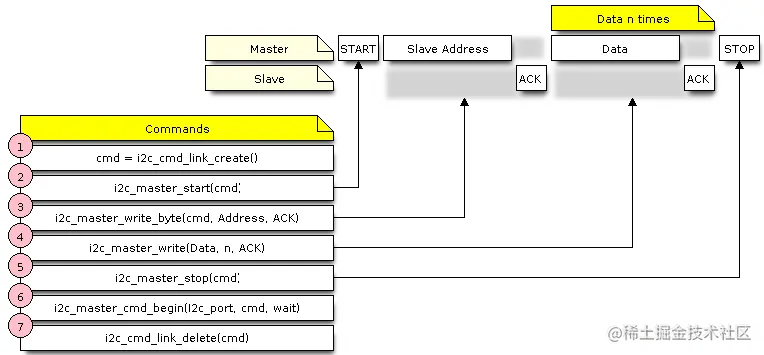 i2c_cmd_link_create()。 然后,用要发送到从站的一系列数据填充它: 1. 起始位 -i2c_master_start()