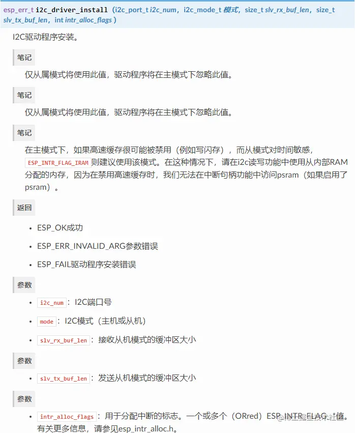 以下 I2C 接口位于 driver/include/driver/i2c.h。