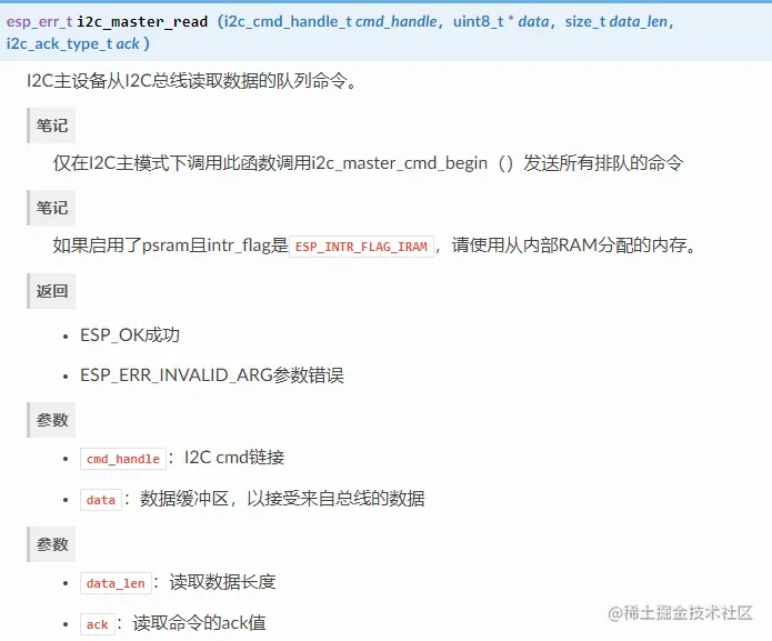 i2c_master_write...函数而是使用i2c_master_read_byte()或i2c_master_read()。同样,配置步骤5中的最后一次读取,以便主机不提供ACK位。 -