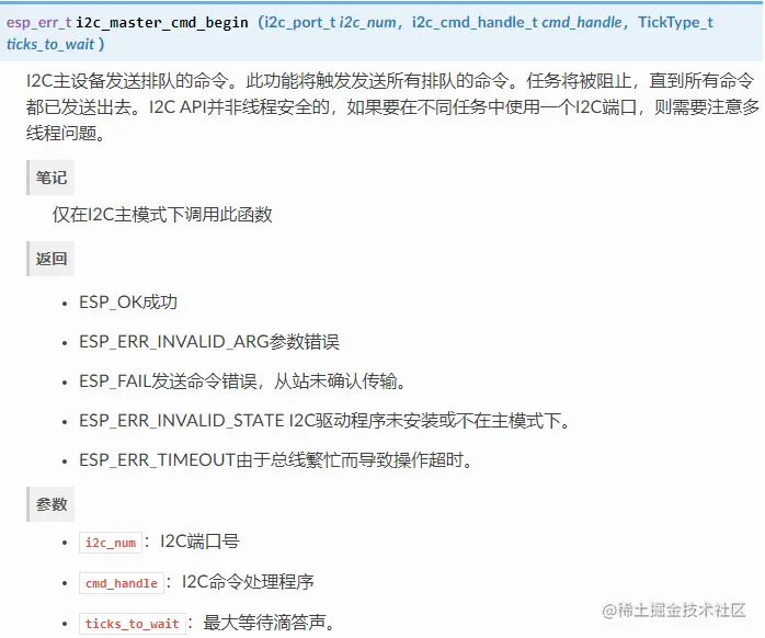 i2c_master_cmd_begin()。一旦触发执行,就不能修改命令链接。 -
