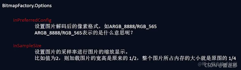 我们可以看到,实际上安卓给我们提供的,这样的参数进行优化。这个参数就是我们的 BitmapFactory.options 里面的这两个参数。我们的 inPreferredConfig 这一个参数,就是用来设置我们的像素格式的,也就是每一个像素占用多少,占用多少个字节。