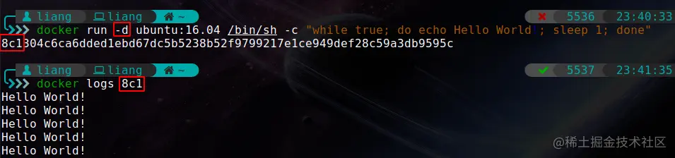但是,如果我们使用后台运行,则会出现如下图所示的结果,需要注意输出的哈希值的前3位,它是后台运行docker容器的唯一Container id,通过这3位我们可以查看docker后台容器运行结果。此时,docker容器会在后台每秒输出一个Hello World!,而不会在宿主机的终端输出结果。但是我们可以通过docker logs命令查看输出结果。