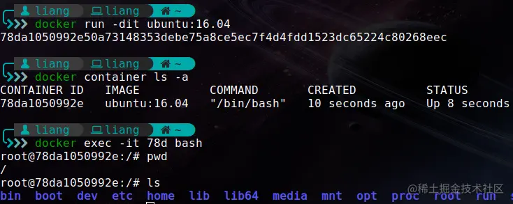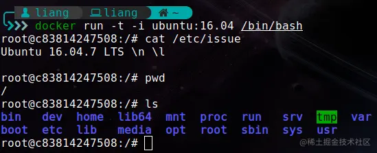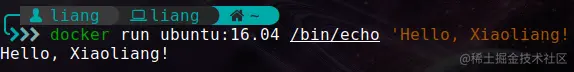 比如,我们可以在本地通过ubuntu:16.04容器的bash终端输出Hello, Xiaoliang!并终止容器: