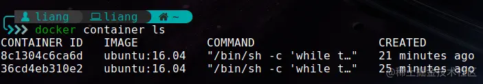 我们还可以通过docker container ls来查看运行的容器信息,如下图所示,运行了两个docker容器: