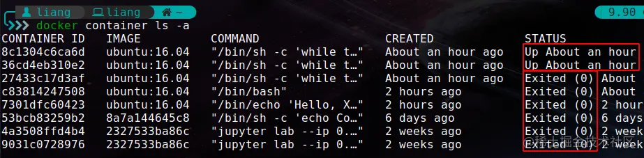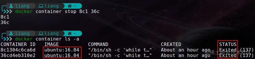然后,使用docker container ls -a查看结果,运行的两个容器状态变为了Exited状态,即实现了容器的终止操作。