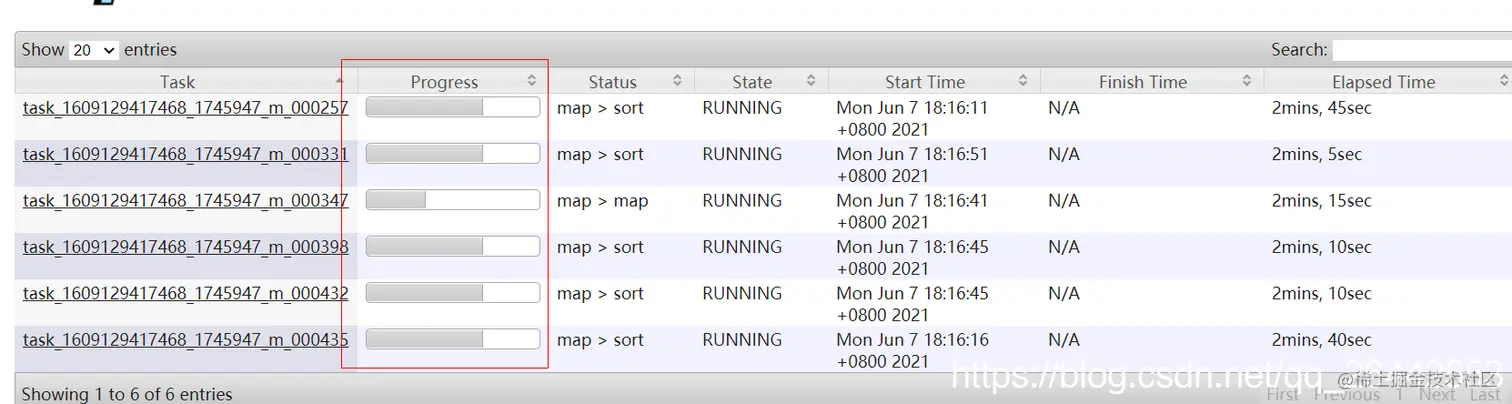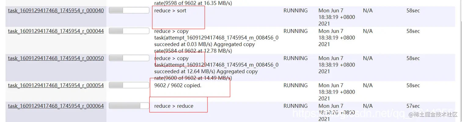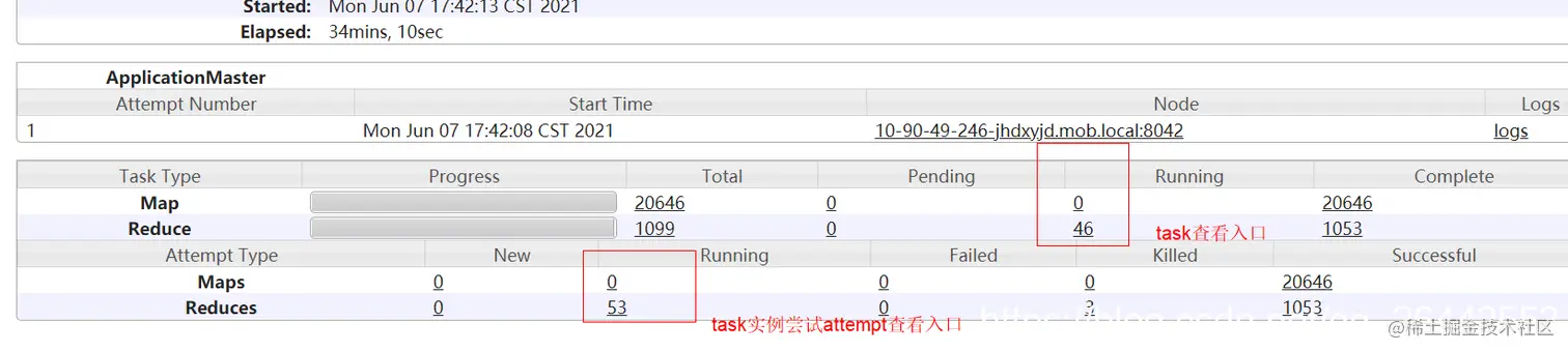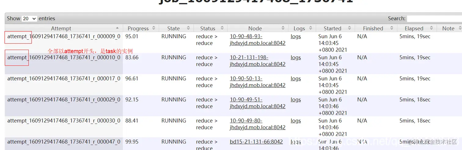 注意:任务还是task开头的,两个查看的入口是不同的,我们一般关注的是task的进度,一个task任务可以有多个attmpt实例在跑,具体牵扯到推测执行。