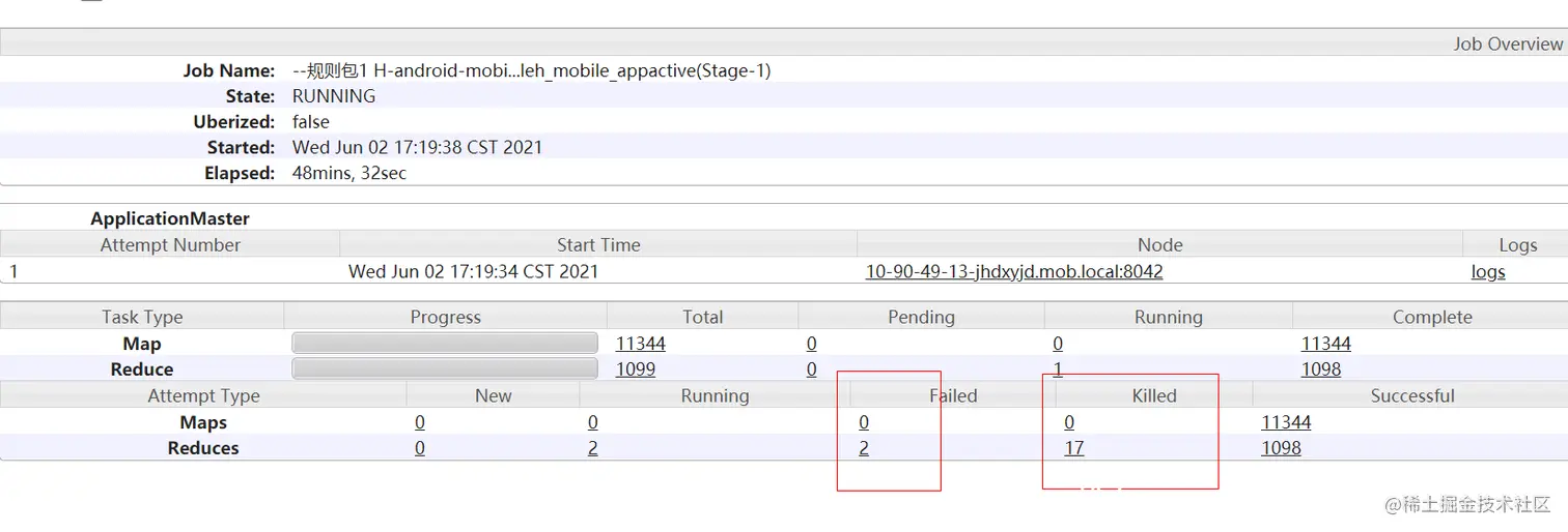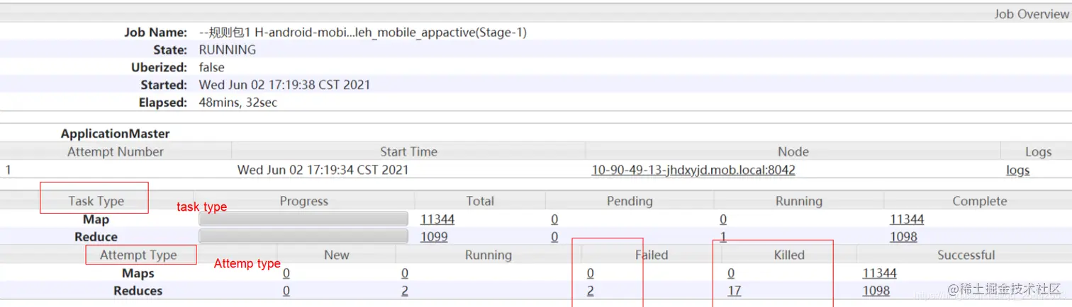 如下任务yarn界面很常见,比如reduce出现了2个failed,17killed,那么对我任务最终结果有没有影响呢?如果没有影响原因是啥呢?比如下面Task Type和 Attemp Type两个栏目都有map/reduce的状态和个数统计,两者的区别是什么?要想深入了解这些问题,就先要弄明白mapredcue/hive任务的Tast容错机制。