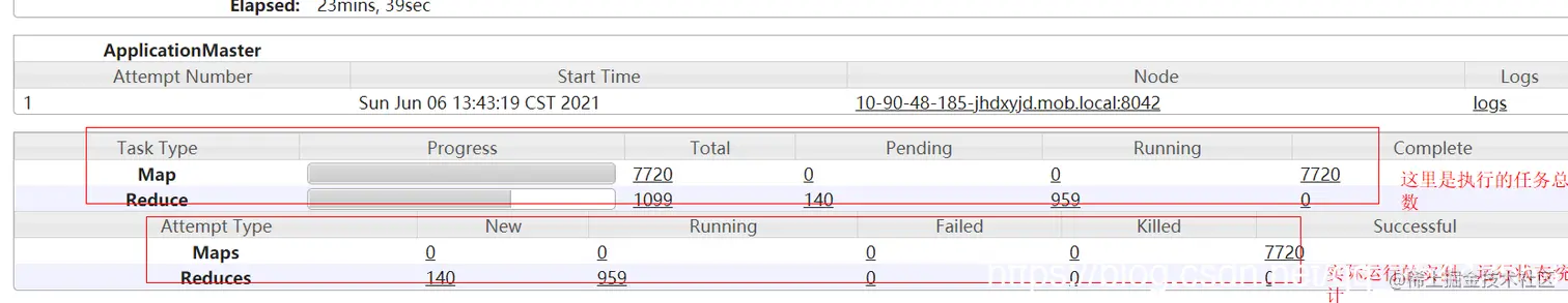 MapRecue/Hive 任务分成maptask和reducetask,每个类型的task的总数一般是根据数据量和参数配置决定,在任务起始阶段已经确定。yarn界面的Task Type统计的就是提交yarn时需要执行的task任务数量。而实际一个task允许尝试多次运行,每次运行尝试的实例就被称Task Attempt,也就是yarn任务日志界面Attempt Type里统计的数据。这也就是为啥map/reduce的实例都是以attmp_****开头的原因,因为任务的运行实例是attemp。