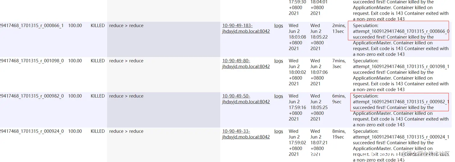 3.一个任务实例attempt被killed一般就两种情况,一是客户端主动请求杀死任务,二是框架主动杀死任务。对于后者,一般是由于作业被杀死或者该任务的备任任务(推测执行)已经执行完成,这个任务不需要继续执行了,所以被Killed。比如nodemanager节点故障,比如停止等,这时候上面的所有任务实例都会被标记为killed。其他再比如任务执行超出某些阈值范围,比如动态分区超过最大文件数,所有任务都会被杀死killed.