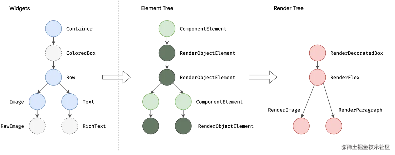 他们分别是Widgets树,Element树和Render树。其中Widgets树和Element树是一一对应的。而Render树和Element中的RenderObjectElement是一一对应的。