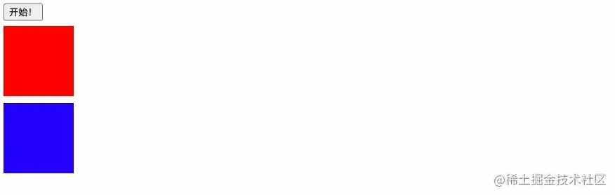 在页面中画了两个正方形,当点击按钮的时候方块开始运动,红色方块是使用 setInterval 实现的动画,蓝色方块使用的是 requestAnimationFrame。