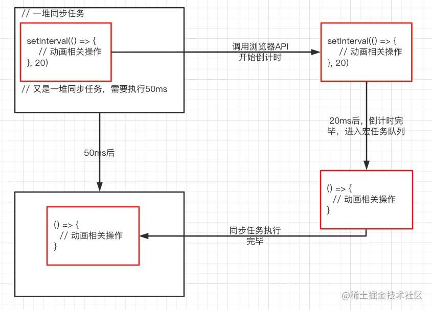 在这个过程中问题就来了,如果说同步代码的执行需要50ms,而定时器设置的定时只有20ms,那么由于事件循环的机制,还是要等待同步任务执行完整之后再来执行微任务队列中的定时器回调,而这中间,又相隔了30ms,在这30ms的过程中,定时器的回调一直处于 pendding 的状态。如果定时器中是动画相关的操作,那也需要在预期的时间上多等待50ms。