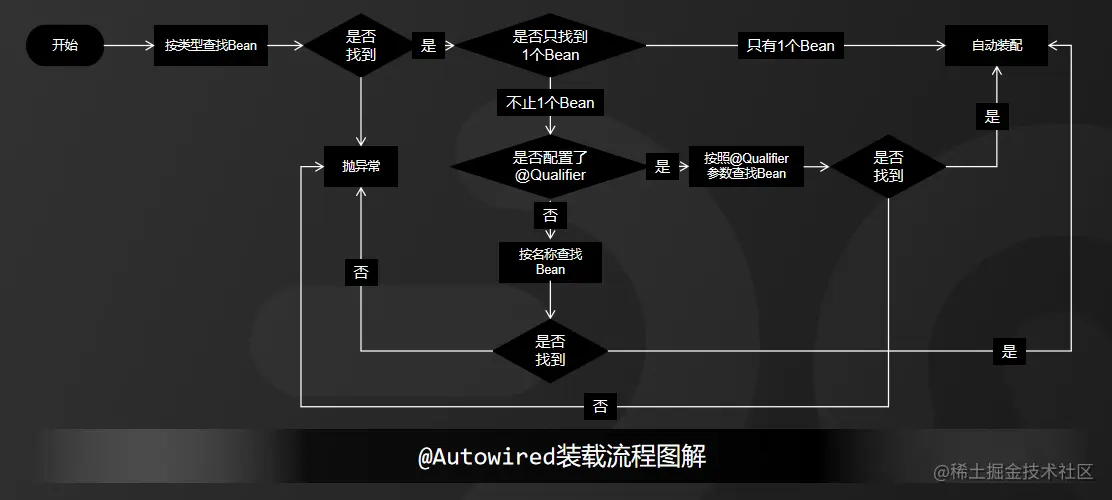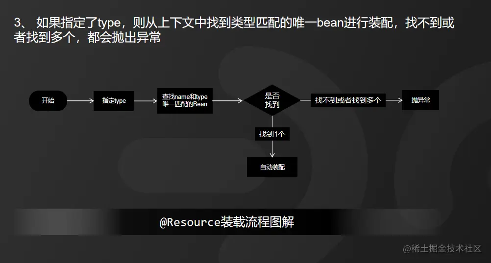 3) 如果指定了type,则从上下文中找到类型匹配的唯一bean进行装配,找不到或者找到多个,都会抛出异常,具体流程如图所示: