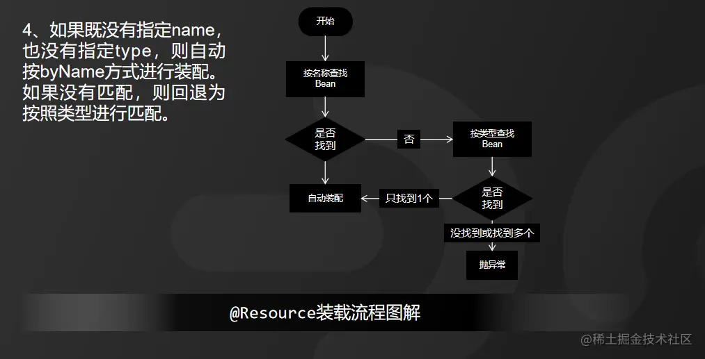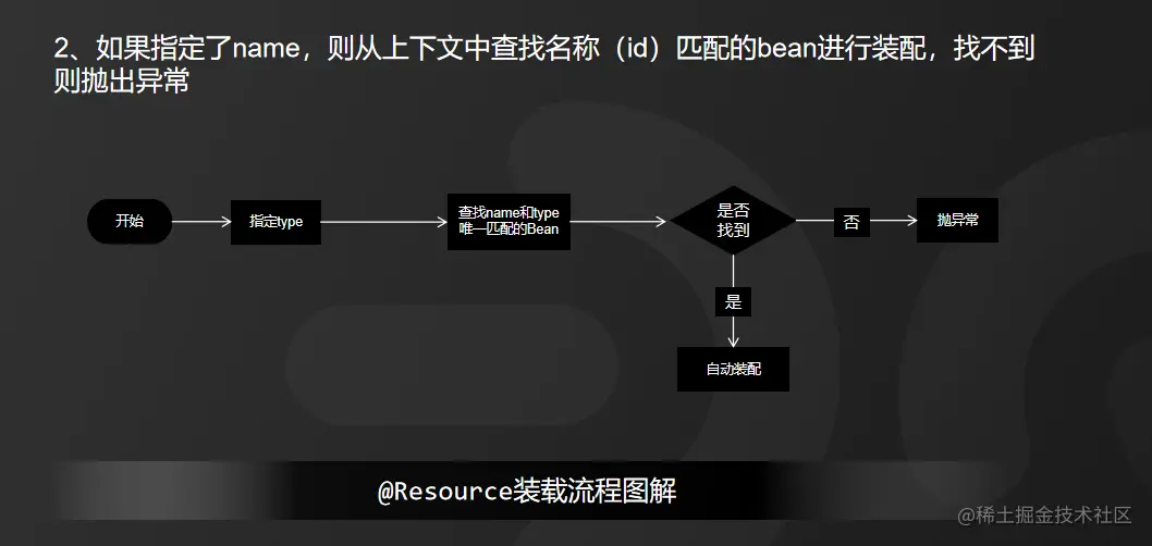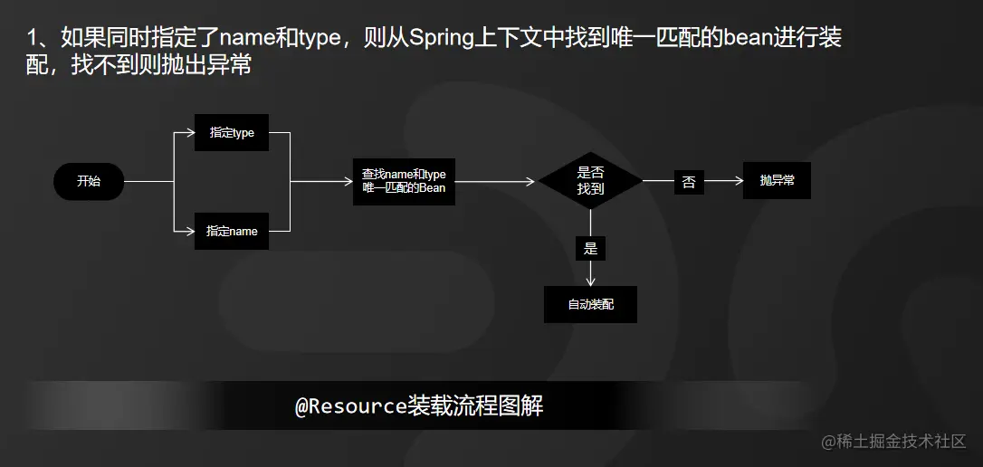 1)如果同时指定了name和type,则从Spring上下文中找到唯一匹配的bean进行装配,找不到则抛出异常,具体流程如图所示: