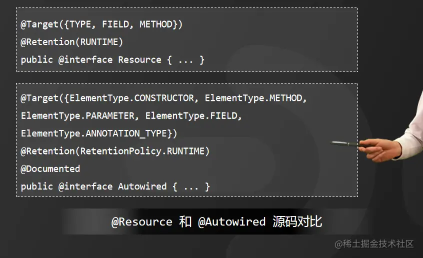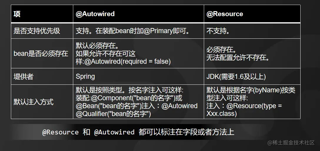 @Autowired能够用在构造方法、成员变量、方法参数以及注解上,而@Resource能用在类、成员变量和方法参数上,这点从源码也能看得出来。
