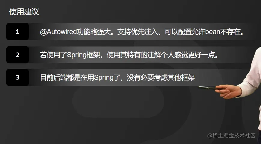 第3:有人会认为@Resource更加通用,因为它是个规范,其他框架也会支持。但我认为,目前后端都是在用Spring了,没有必要考虑其他框架。