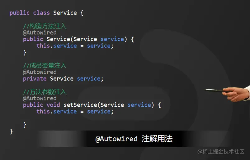 @Autowired这个注解呢,是由Spring提供的,它可以用来对构造方法、成员变量以及方法参数上进行标注,能够根据对象类型完成自动注入。