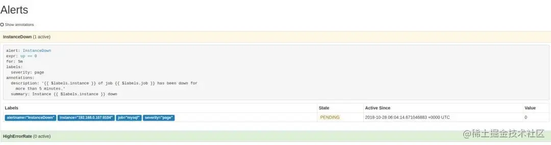 访问 http://localhost:9090/alerts 可以看到根据配置的规则生成的告警: