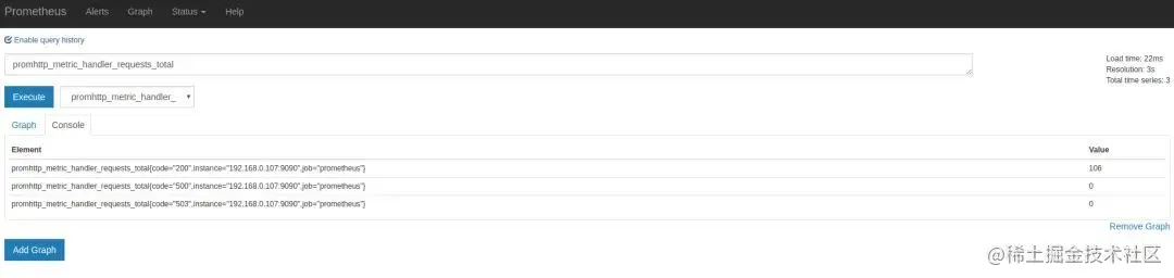 promhttp\_metric\_handler\_requests\_total{code="200",instance="192.168.0.107:9090",job="prometheus"} 106