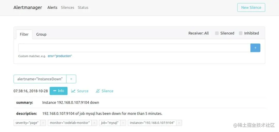 这个时候再访问 Alertmanager,可以看到 Alertmanager 已经接收到告警了:
