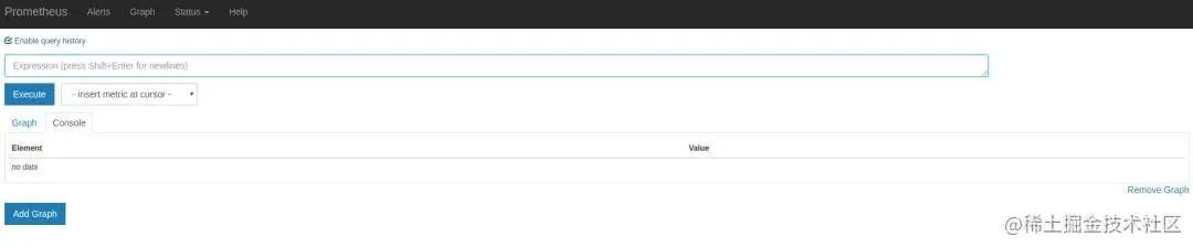 通过上面的步骤安装好 Prometheus 之后,我们现在可以开始体验 Prometheus 了。Prometheus 提供了可视化的 Web UI 方便我们操作,直接访问http://localhost:9090/ 即可,它默认会跳转到 Graph 页面:
