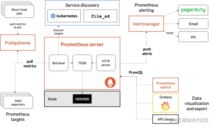 除了这四大特性,随着 Prometheus 的不断发展,开始支持越来越多的高级特性,比如:服务发现,更丰富的图表展示,使用外部存储,强大的告警规则和多样的通知方式。下图是 Prometheus 的整体架构图: