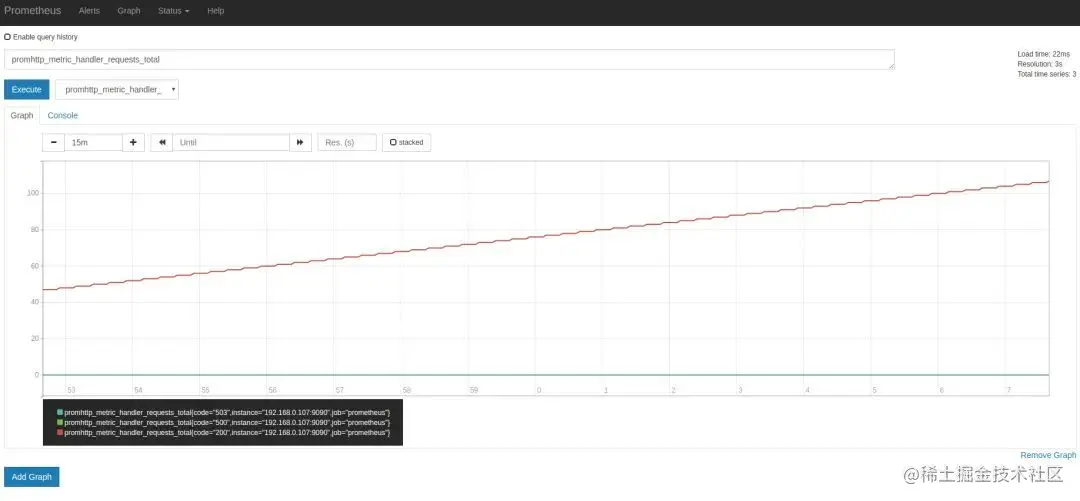 上面在介绍 Prometheus 的配置文件时,可以看到 scrape_interval 参数是 15s,也就是说 Prometheus 每 15s 访问一次 /metrics 页面,所以我们过 15s 刷新下页面,可以看到指标值会自增。在 Graph 标签中可以看得更明显: