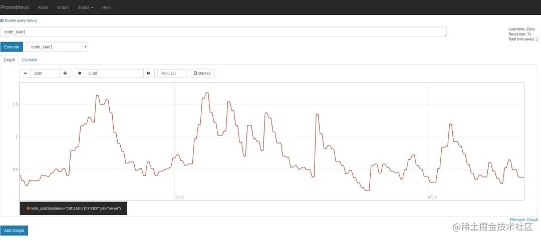 实际上 Graph 页面才是 Prometheus 最强大的功能,在这里我们可以使用 Prometheus 提供的一种特殊表达式来查询监控数据,这个表达式被称为 PromQL(Prometheus Query Language)。通过 PromQL 不仅可以在 Graph 页面查询数据,而且还可以通过 Prometheus 提供的 HTTP API 来查询。查询的监控数据有列表和曲线图两种展现形式(对应上图中 Console 和 Graph 这两个标签)。
