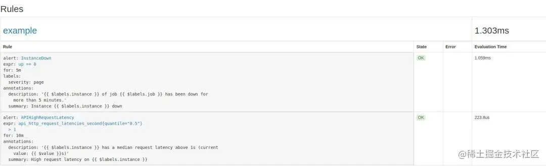 这个规则文件里,包含了两条告警规则:InstanceDown 和 APIHighRequestLatency。顾名思义,InstanceDown 表示当实例宕机时(up === 0)触发告警,APIHighRequestLatency 表示有一半的 API 请求延迟大于 1s 时(api_http_request_latencies_second{quantile="0.5"} > 1)触发告警。