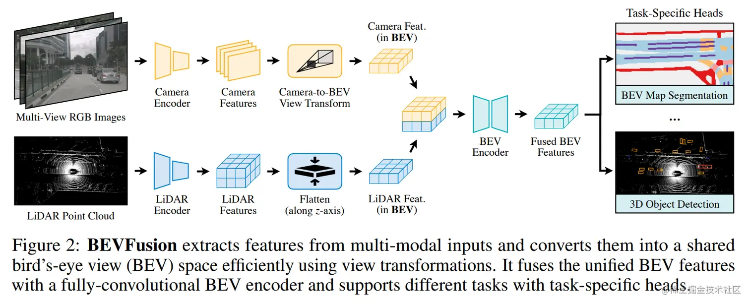 多传感器融合对于准确可靠的自动驾驶系统至关重要。最近的方法是基于点级融合:用相机特征增强 LiDAR 点云。然而,相机到激光雷达的投影丢弃了相机特征的语义密度,阻碍了这种方法的有效性,特别是对于面向语义的任务(如 3D 场景分割)。在本文中,我们使用 BEVFusion 打破了这种根深蒂固的惯例,这是一种高效且通用的多任务多传感器融合框架。它统一了共享鸟瞰图(BEV)表示空间中的多模态特征,很好地保留了几何和语义信息。为了实现这一目标,我们通过优化的 BEV 池来诊断和提升视图转换中的关键效率瓶颈,将延迟减少 40 倍以上。 BEVFusion 基本上与任务无关,并且无缝支持不同的 3D 感知任务,几乎没有架构变化。它建立了 nuScenes 的最新技术,在 3D 对象检测上实现了 1.3% 的 mAP 和 NDS,在 BEV 地图分割上实现了 13.6% 的 mIoU,计算成本降低了 1.9 倍。