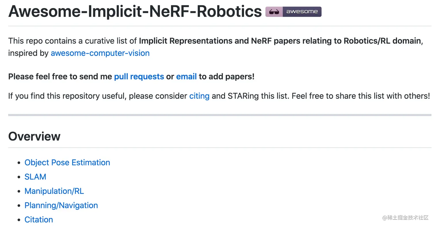 资源列表:Awesome-Implicit-NeRF-Robotics - 与机器人/强化学习领域相关的隐表示与NeRF的论文资源大列表