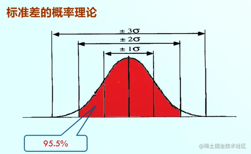 同理,均值加减2倍的标准差概率约等于95.5%,那么他的物理意义是均值加减2倍的标准差,也就是红色的部分围住的面积占总面积的95.5%。