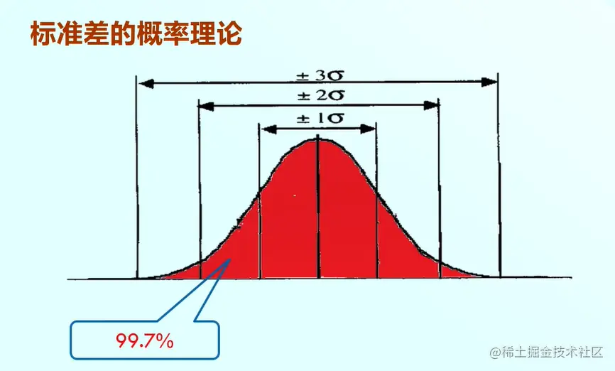 同理,均值加减3倍的标准差概率约等于99.7%,那么他的物理意义是均值加减3倍的标准差,也就是红色的部分围住的面积占总面积的99.7%。