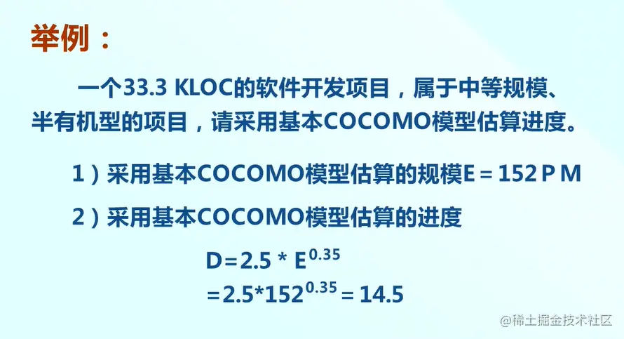 比如说某个企业项目数据的研究出模型: D = 3 * E的1/3次幂,因此可以进行进度估算。
