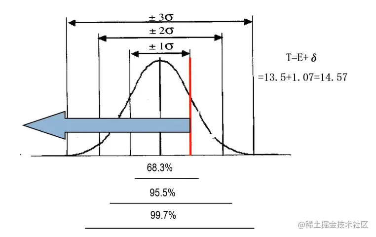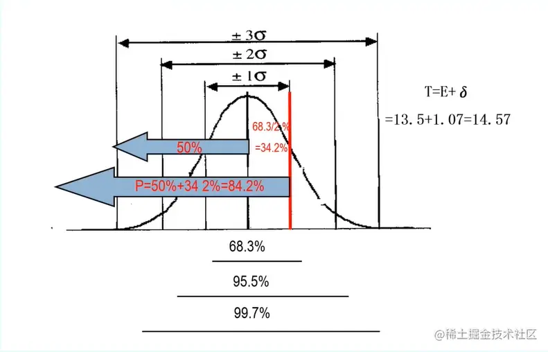 刚刚上面项目的历时估算 E 也就是均值是13.5,那么均值减去1倍的标准差,既13.5-1.07= 12.43,均值加上1倍的标准差等于14.57,所以项目从12.43天—14.57天内完成的概率为68.3%。如下图:以此类推…
