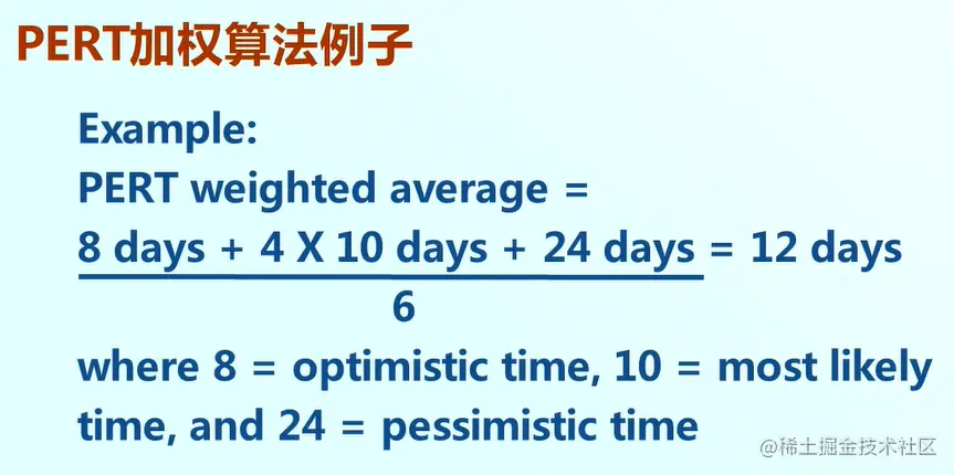 举例:对某一个任务采用PERT加权算法,(8+4*10+24)/6,最后等于12天,所以这个任务估算的时间是12天。