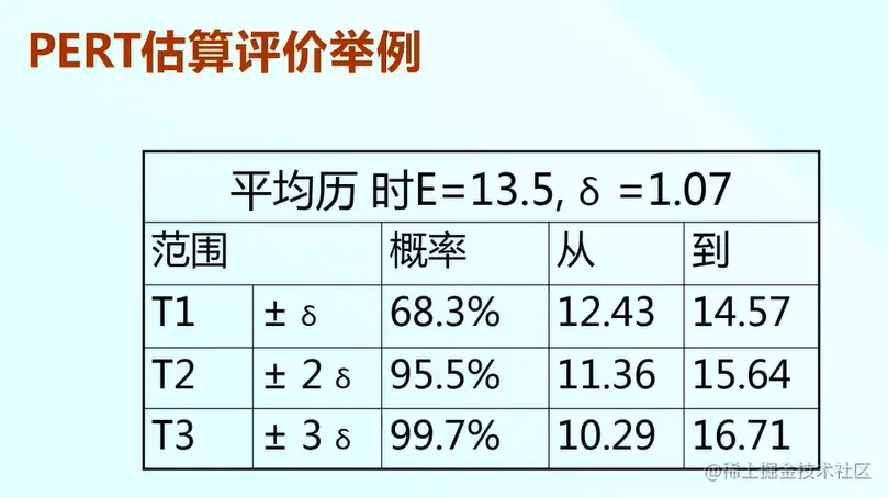 我们利用这个标准差来评价这个PERT历时估算结果,为了评价这个估算结果,需要应用一个概率的理论。