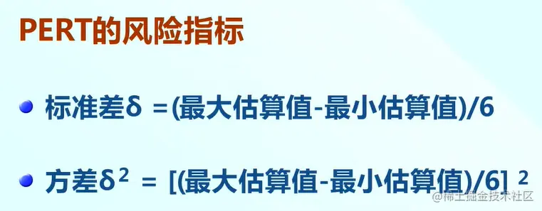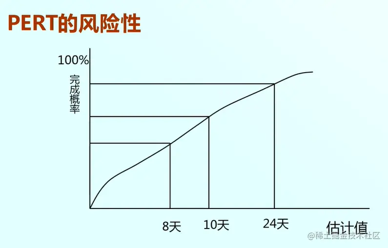 PERT估算方法是在估算任务过程当中存在分析时采用的方法,24天,8天,10天,这些天完成的概率肯定是不同的,24天完成的概率肯定是大于8天完成的概率,概率不同风险也就不同。