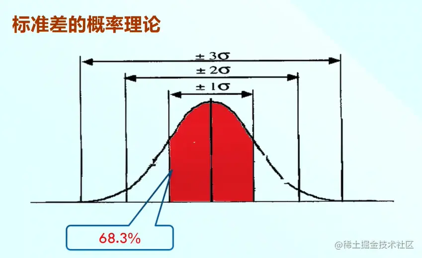 正态分布的均值减去一个标准差的概率约等于68.3。那么他的物理意义是均值加减1倍的标准差,也就是红色的部分围住的面积占总面积的68.3%。