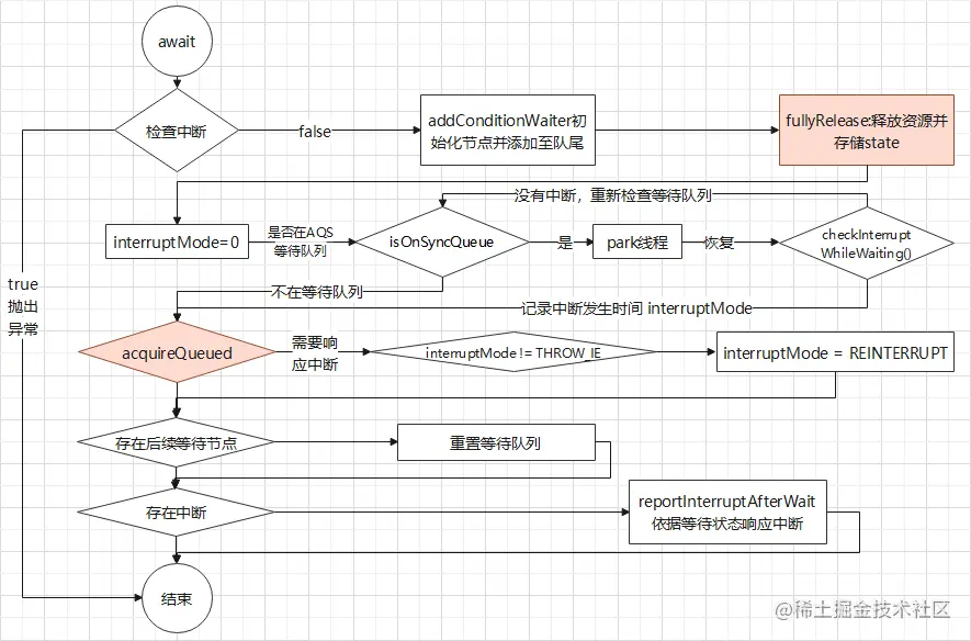 对应Object.wait(),通过AQS机制释放锁定的资源,终止当前线程,恢复后使用AQS独占模式重新锁定资源