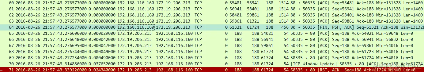 对比分析正常时的抓包,一眼看过去确实干净很多。服务器端 192.168.116.160 在帧 64 发送了同样的 FIN/ACK,Seq 61321 + Len 402 + FIN 1 = NextSeq 61724,客户端 172.19.206.213 在帧69 时ACK 确认了 61724 之前的数据,包含了对 FIN 1字节的确认。客户端同样发送了一个窗口更新的 ACK,之后通过 RST 直接关闭了连接。